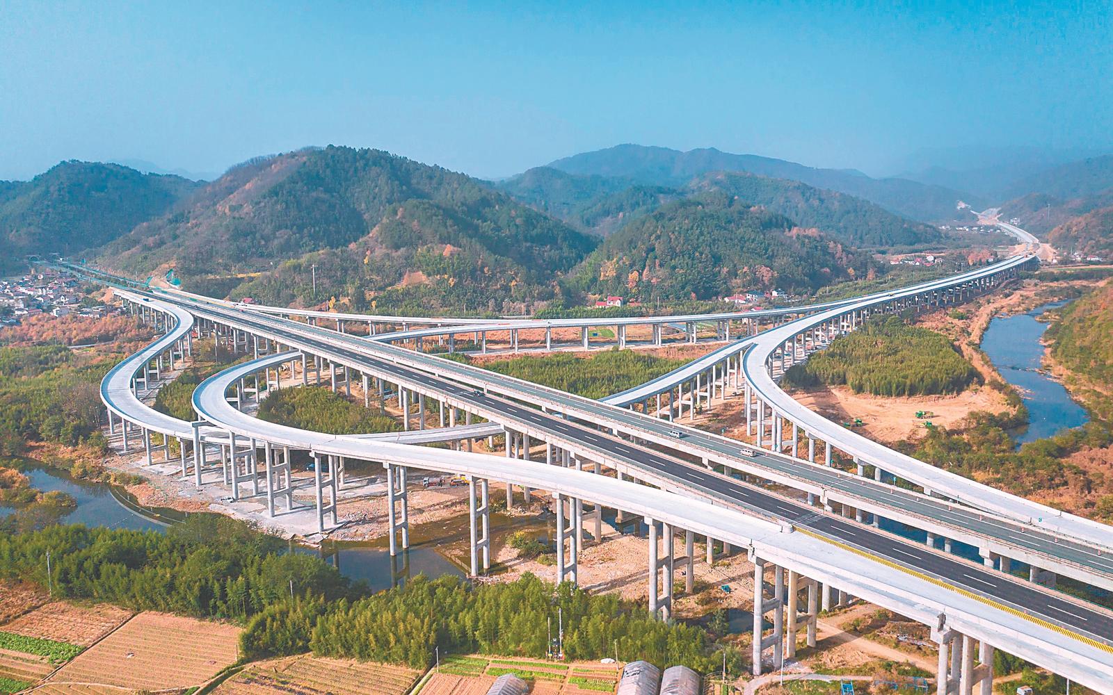 11月27日,在宁国市胡勒镇,衬砌高速公路穿过在建的安吉至景德高速公路胡勒枢纽。安靖高速公路是长三角地区进入黄山风景区的便捷通道。是提升皖南山区县际互联互通水平、促进“大黄山”地区与上海、江浙城市群互联互通的重要通道。对促进经济发展和旅游资源开发具有重要作用。通讯员 张明伟 摄